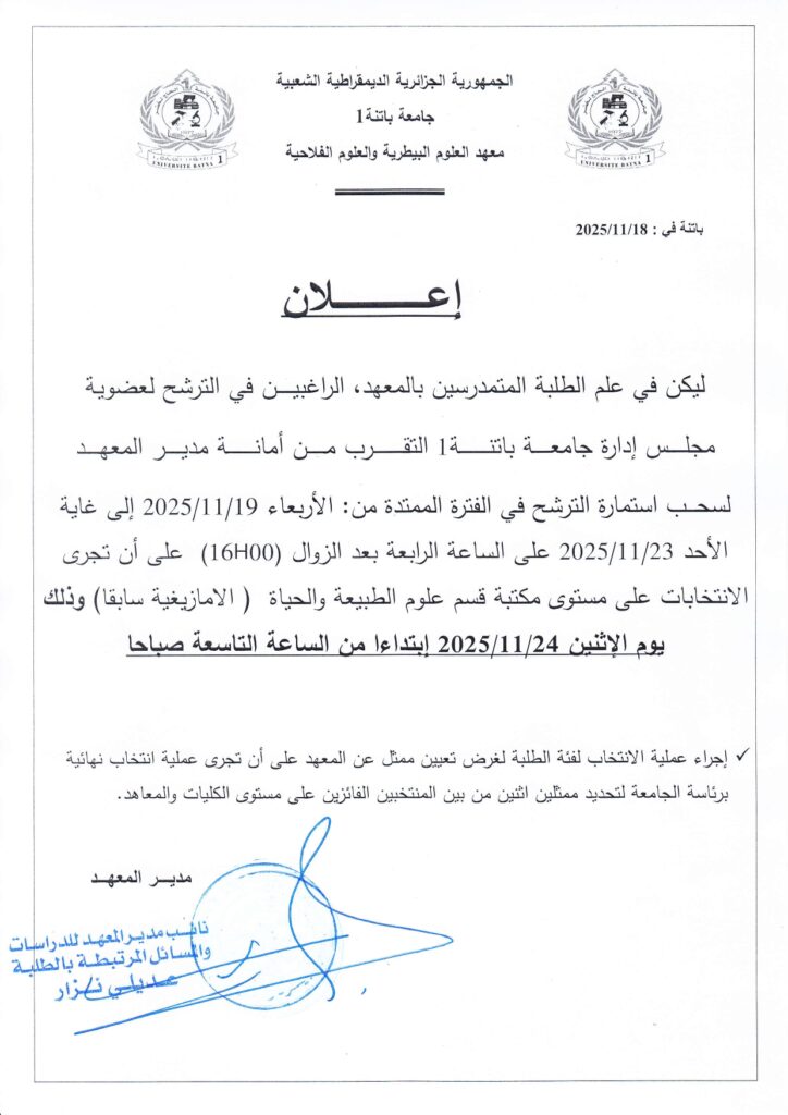 ليكـــــــــن فـــــــــي علـــــم الأساتـــــــذة (مصف الأستاذيـــــــة، فئــــــة الأساتذة المساعدين)الإداريين والتقنيين وأعوان المصالح، الراغبين في الترشح لعضوية مجلس إدارة جامعة باتنة1 التقرب من مصلحة المستخدمين بالمعهد لسحب استمارة الترشح في الفترة الممتدة من 12 إلى 16 نوفمبر2025،على أن تجرىعملية الانتخاب بمصلحة المستخدمين بالمعهد يوم الإثنين الموافق لـــ:17نوفمبر 2025 إجراء عملية الانتخاب لمصف الأستاذية لغرض تعيين ممثل…