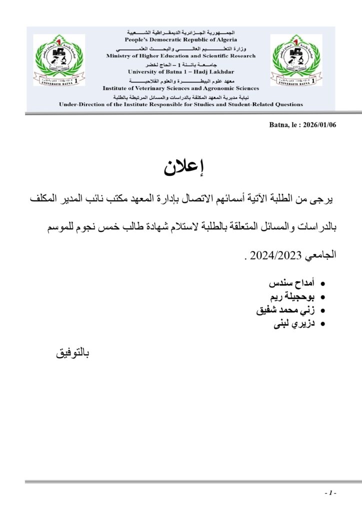 في إطار تكريس الدور الإقتصادي للجامعة و ذلك من خلال توجيه الطلبة لإعداد مشاريع تخرجهم ضمن القرار الوزاري 008 المعدل والمتمم للقرار 1275 (مذكرة تخرج -مشروع مؤسسة اقتصادية)، و حتى يتسنى لعدد كبير من الطلية التسجيل ضمن هذه الآلية ، فقد تم تمديد آجال التسجيل في إطار شهادة جامعية -مشروع مؤسسة اقتصادية إلى غاية 18 ديسمبر 2025