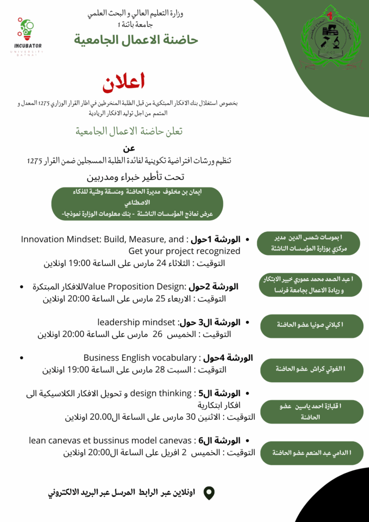 Les étudiants inscrits dans le cadre de l’arrêté 1275 sont invités de se présenter à la salle de réunion de la maison de l’entrepreneuriat le Dimanche 08 Mars 2026 à 10H00. Les étudiants concernés sont : – Les étudiants nouvellement inscrits sur la plateforme – Les étudiants absents durant la session précédente – Les étudiants ayant…