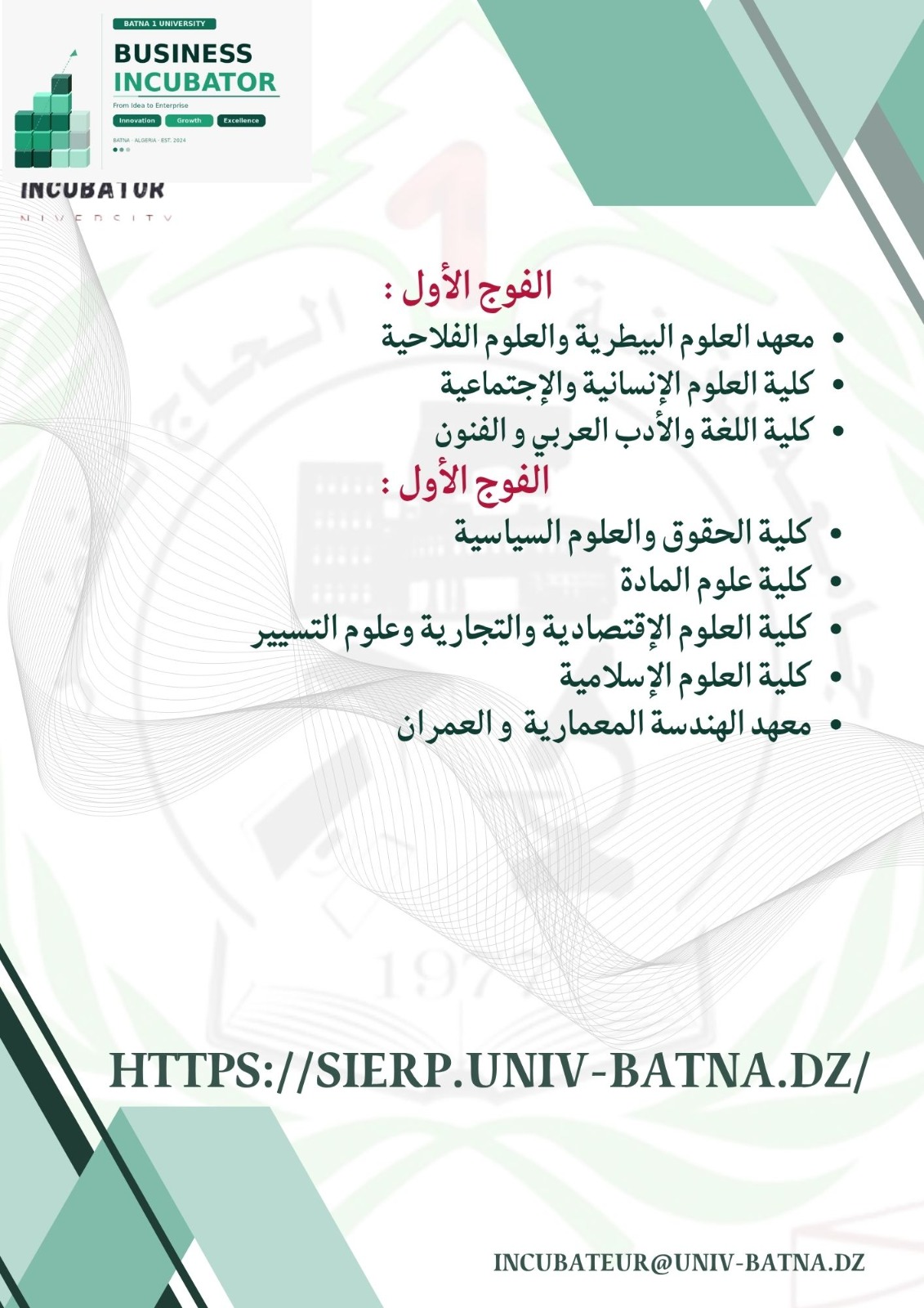 Les étudiants ISVSA en fin de cycle inscrits dans le cadre de l’arrêté 1275 sont invités pour assister à la journée ouverte programmée comme suit : Journée : Mercredi 25 Février 2026. Horaire : 09H30 – 11H00. Lieu de la rencontre : Incubateur Université Batna 1 NB: LA PRÉSENCE DES ÉTUDIANTS INSCRITS EST OBLIGATOIRE